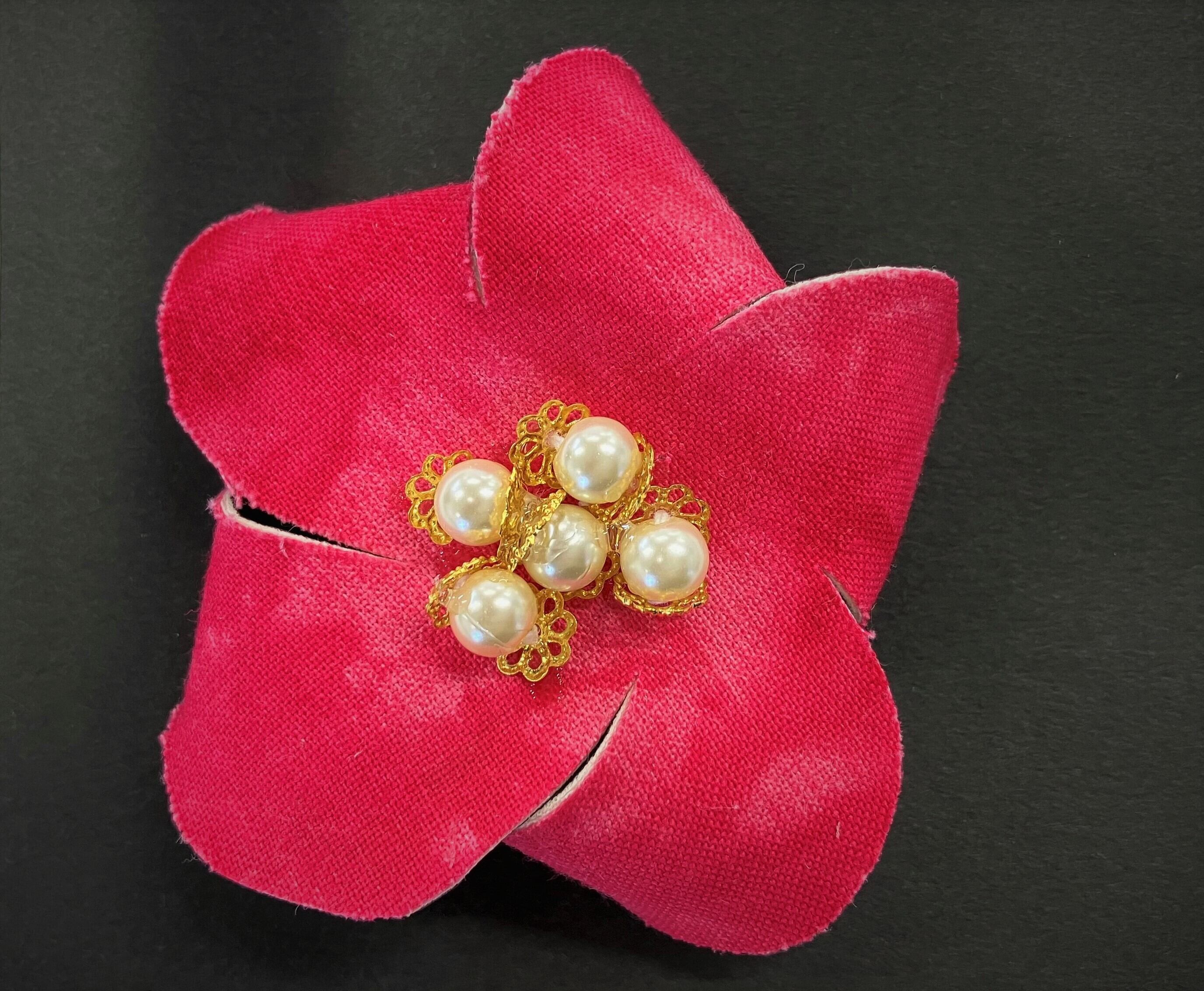 赤色でもしっとりとした風合いのブローチです。合皮素材で立体感があり、雨の日も安心です。